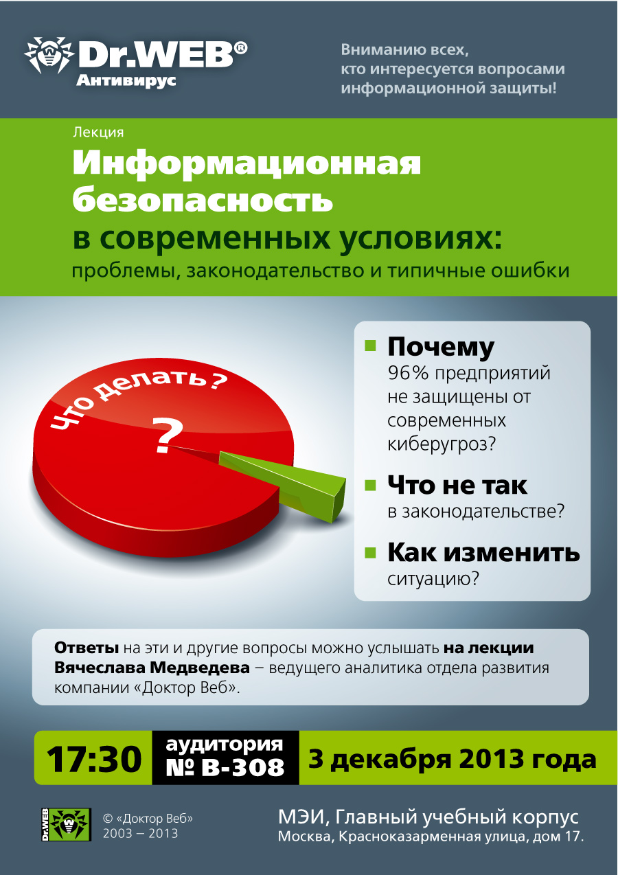 3 декабря 2013 года в 17:30 в аудитории В-308("НИУ "МЭИ", Москва, ул.Красноказарменная, д.17) пройдет открытая лекция специалистов компании "Доктор Веб" на тему "Информационная безопасность в современных условиях: проблемы, законодательство и типичные ошибки. Приглашаются все интересующиеся. Лекция организуется в рамках сотрудничества Олимпиады и компании «Доктор Веб».